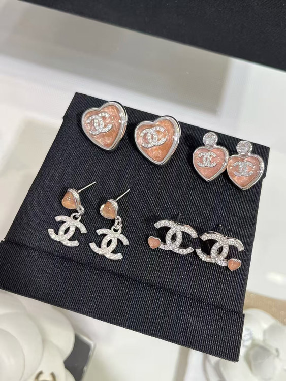 Chanel pink little heart silver full diamond double C earrings-3747