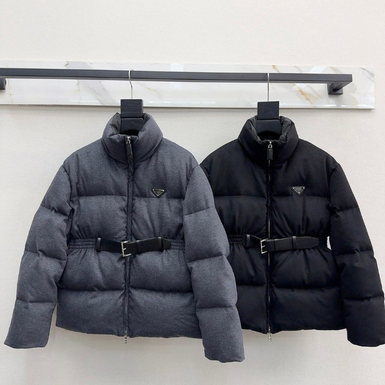 Prada stand-collar wool fabric long-sleeved belted thickened warm down jacket-5346